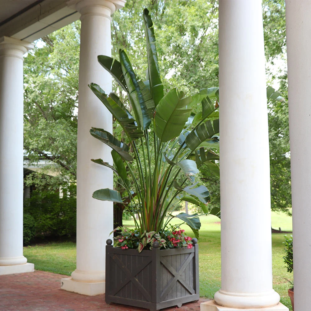 Bird Of Paradise plants have canes and large, thick leaves that are similar to banana leaves. They provide a lush background for the vibrant tropical flowers to pop against.